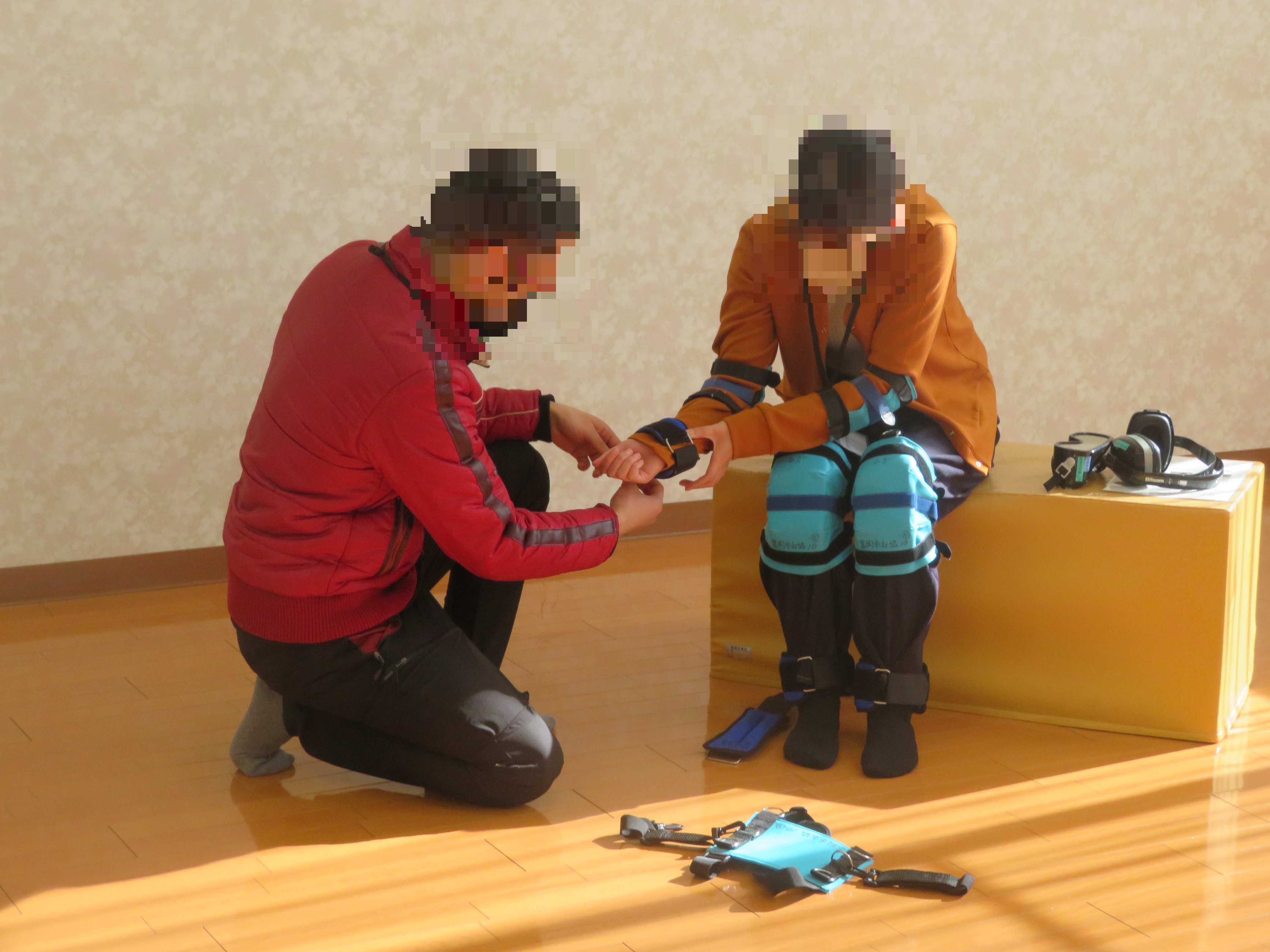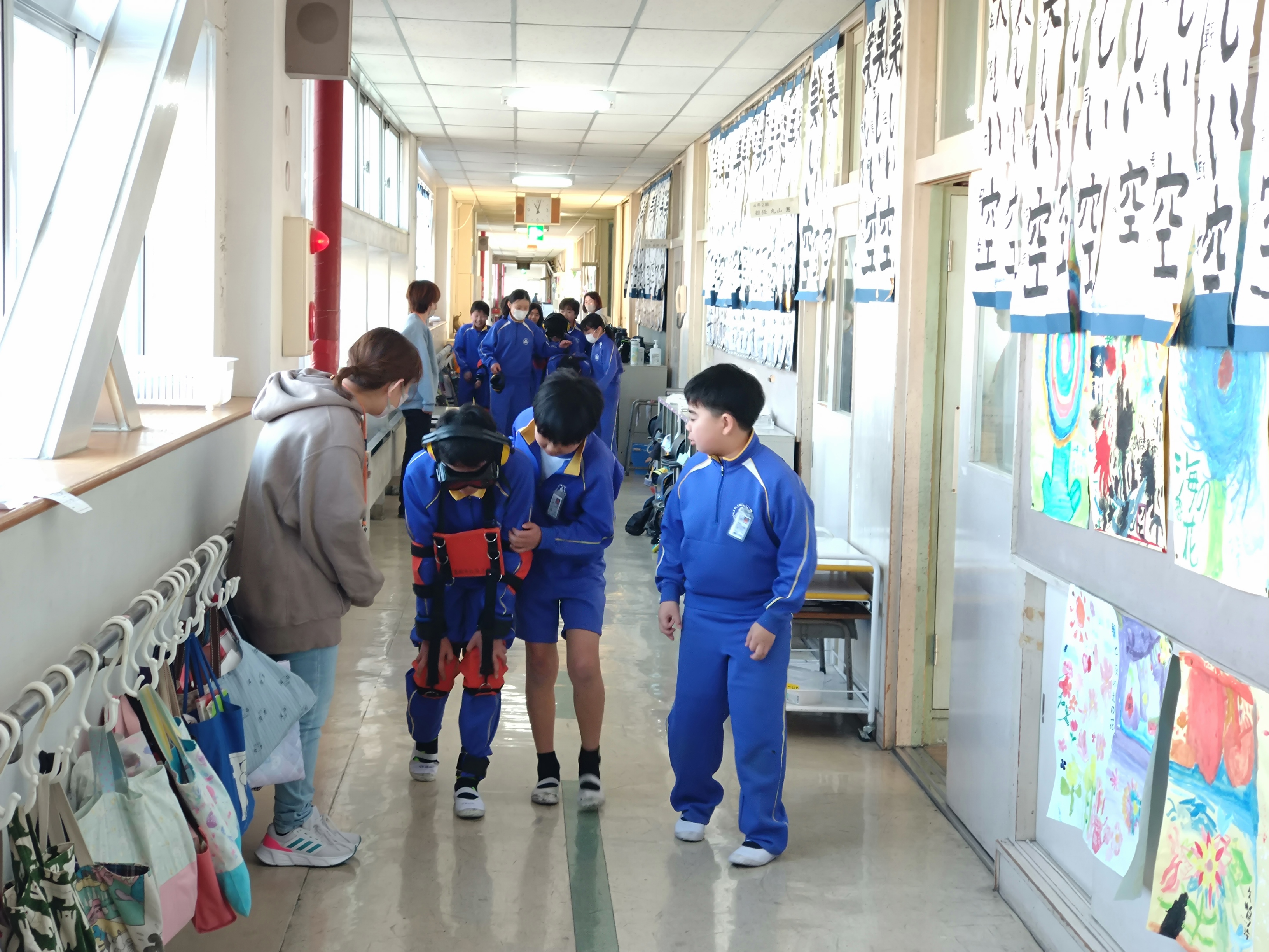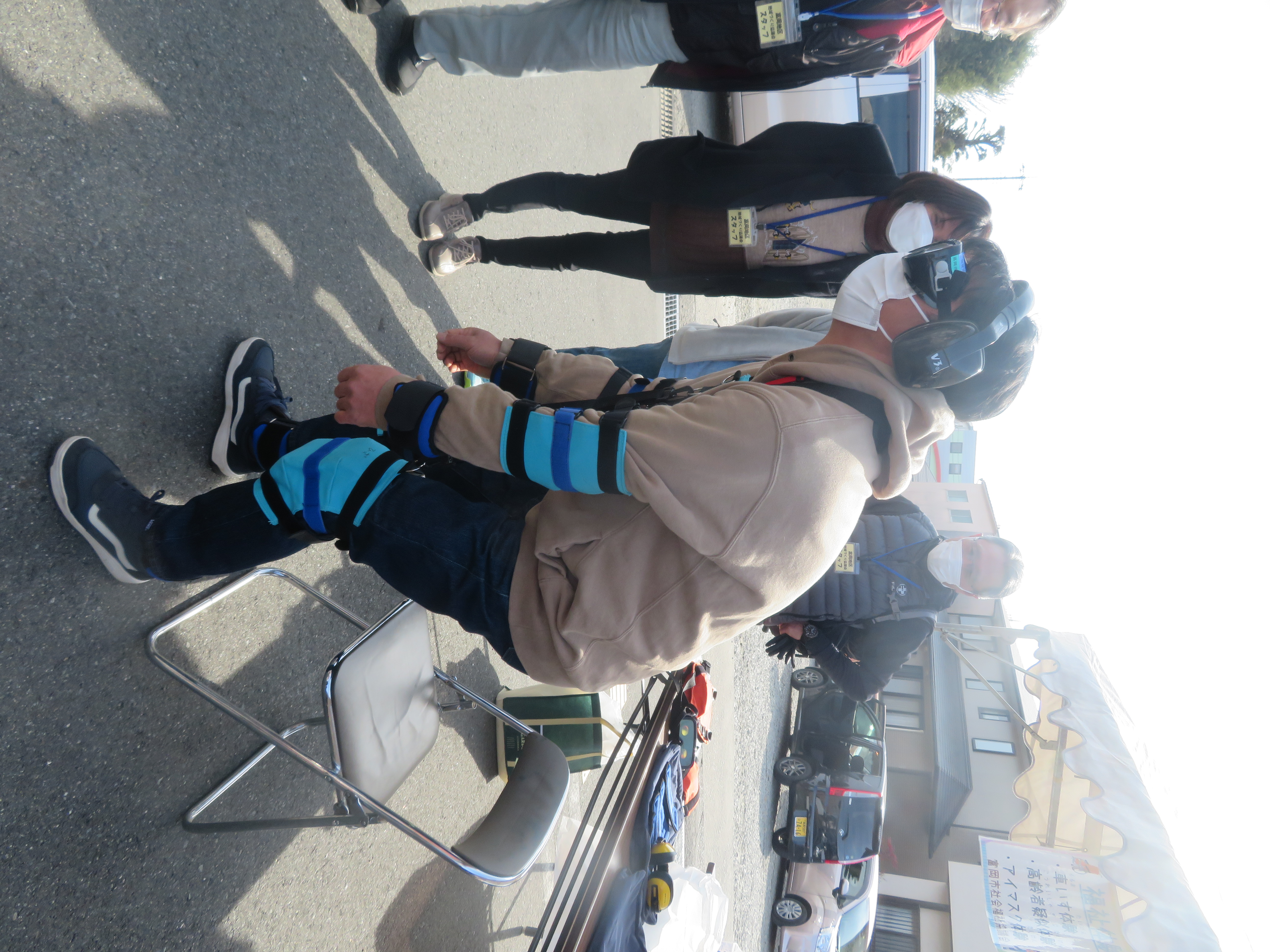 「とみさぽ」の方と一緒に高齢者疑似体験セットの装着や体験中の見守りを行い、スムーズかつ安全に体験を行うことができました。