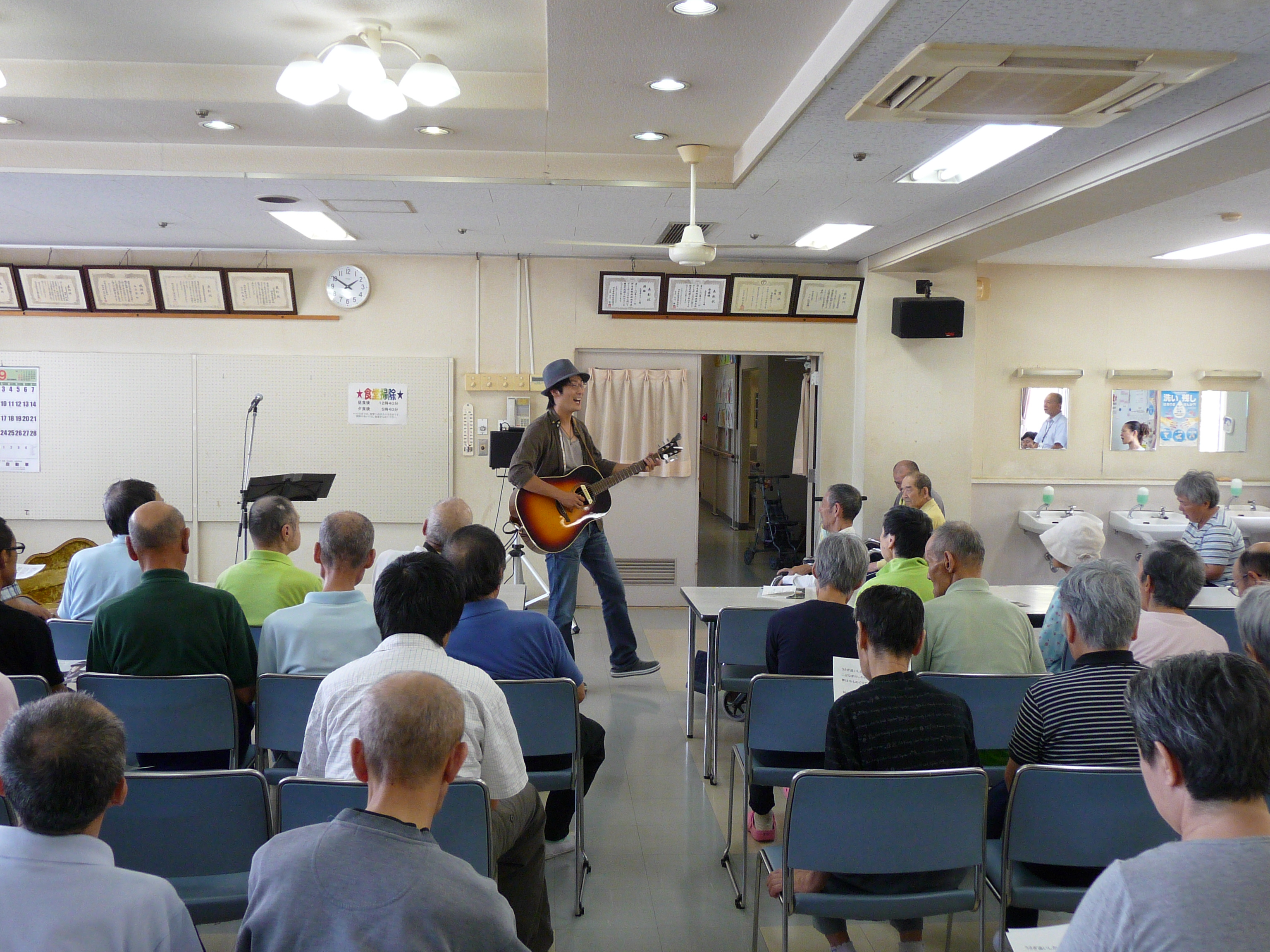 演奏を目の当たりにした利用者たちは、優しさあふれる人柄と透明感のある歌声に魅了され、一緒に歌ったり身体でリズムを刻んだりしながら楽しいひとときを過ごしました。