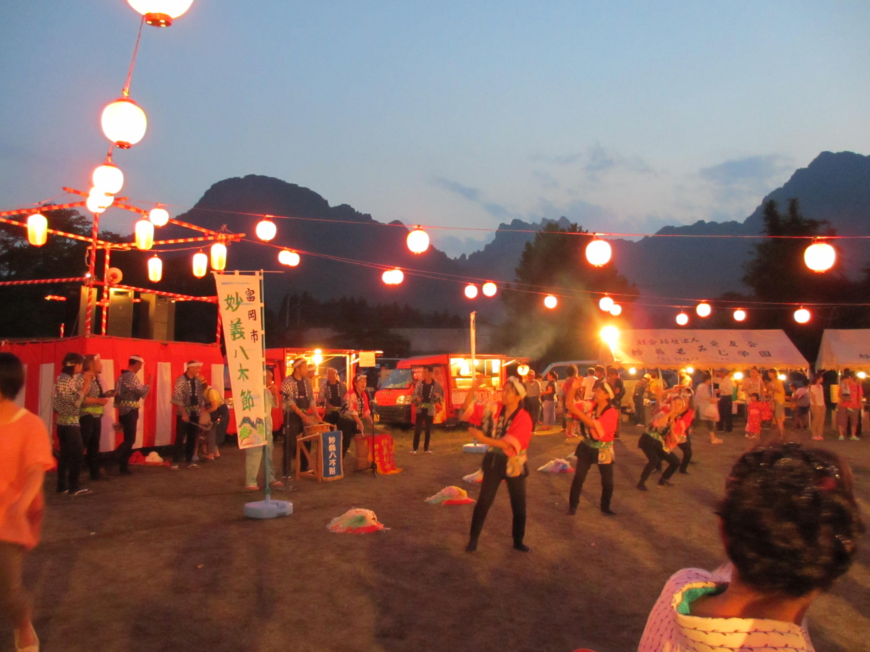 8月1日、市立妙義小学校グラウンドにて妙義もみじ学園との合同納涼祭を開催しました。当日は天候の悪い中、大勢のご来場をいただき盛大に執り行われました。踊り、八木節、フラダンス、雷太鼓の協力団体のご参加もあり、いっそう盛り上がりました。