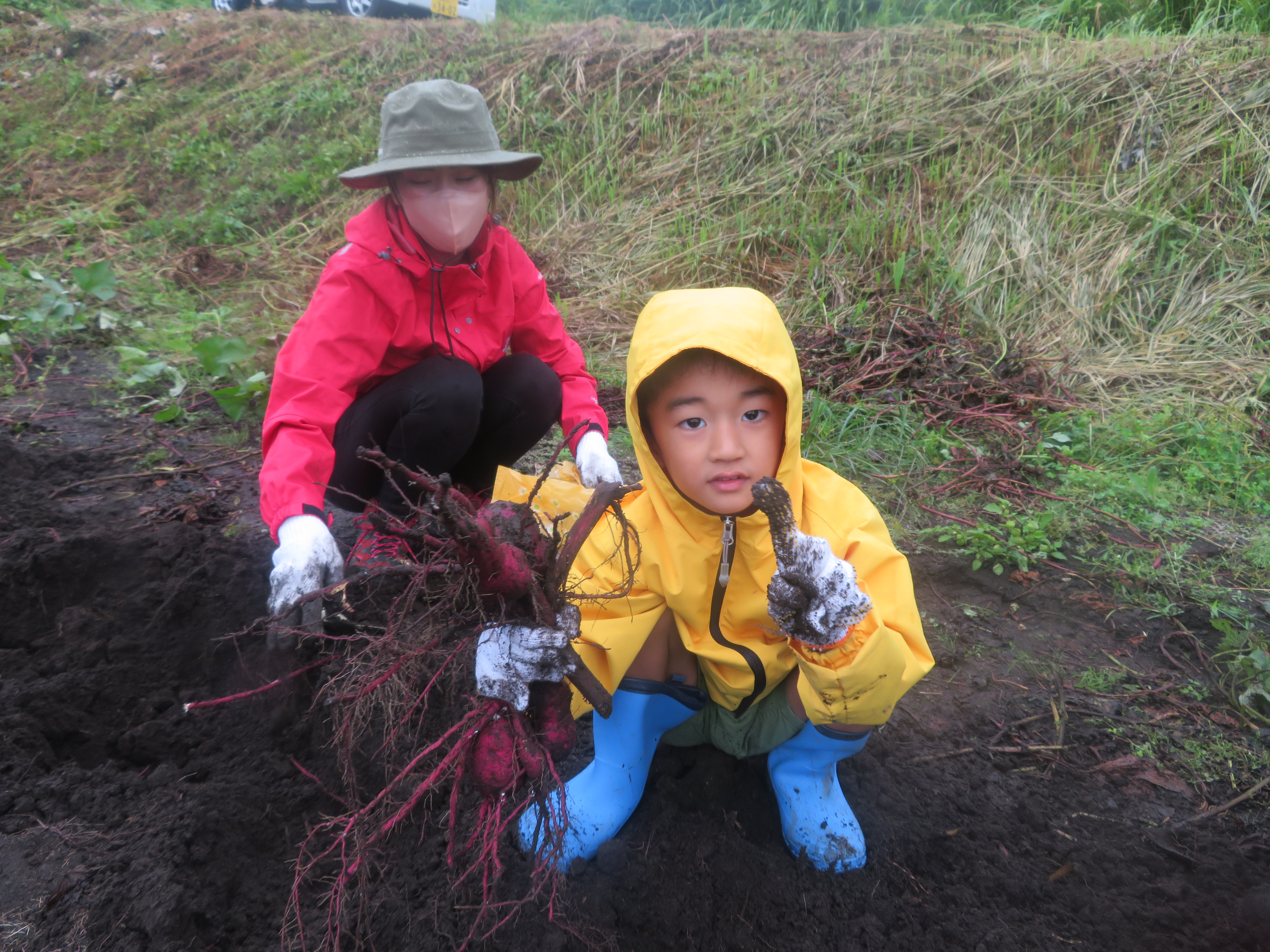 本日のさつまいも収穫祭は、小雨が降り続いておりますが予定通り開催いたします。雨具等を準備の上、ご参加ください。