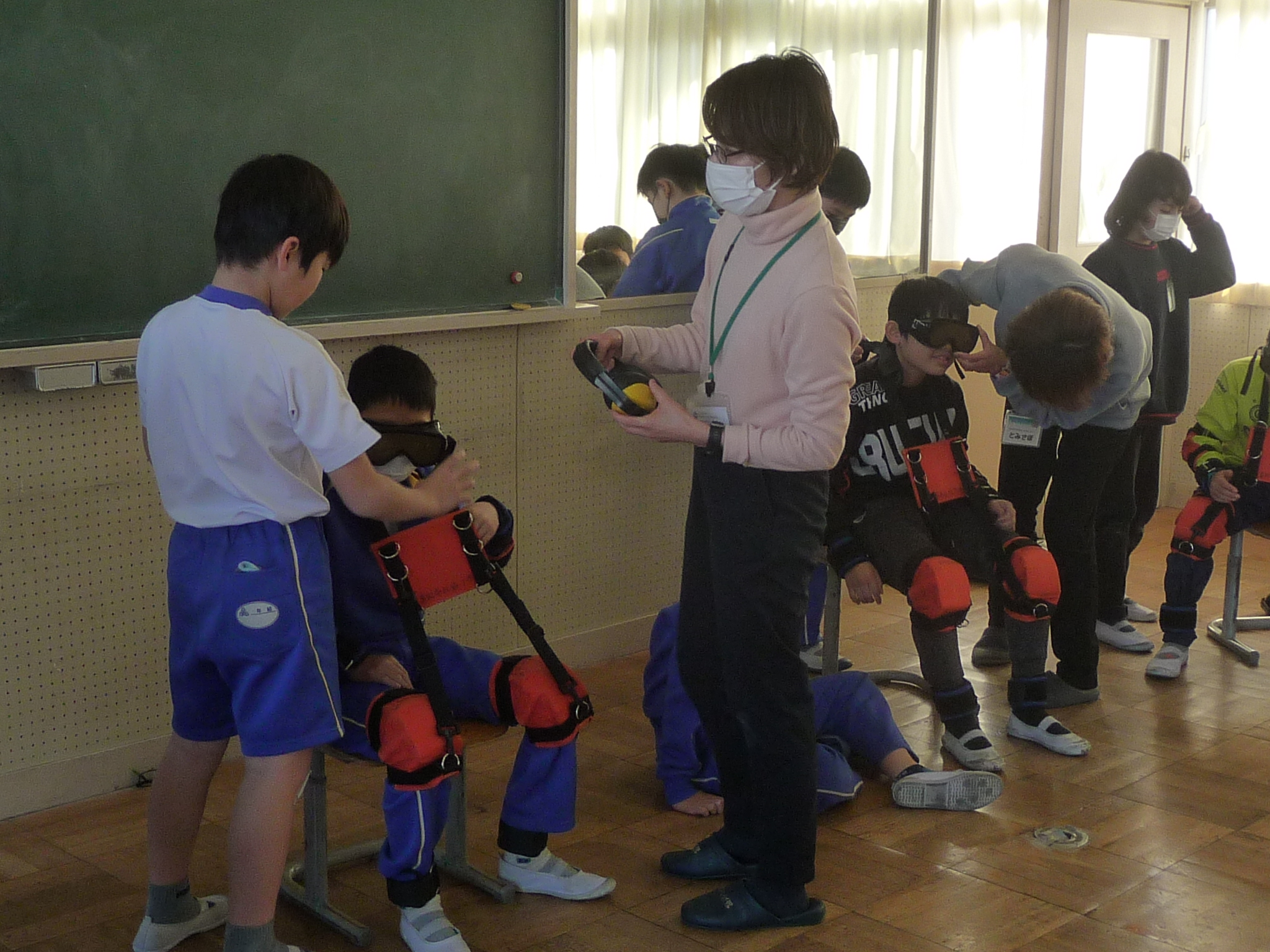 富岡小4年生の総合的な学習の時間で、福祉教育として、職員による福祉講話や車椅子などの体験を行いました。高齢者疑似体験とアイマスクの体験では、富岡小の学校支援ボランティア「とみさぽ」にご協力いただきました。